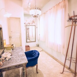 淡いブルーを基調としたデザインとピンクの花の装飾がかわいいお部屋です 。女の子が憧れるキラキラしたお部屋でプリンセスのようにヘアセットやメイクを行います。