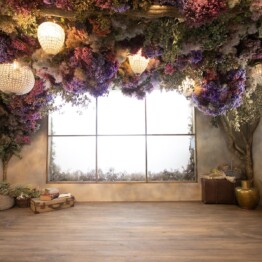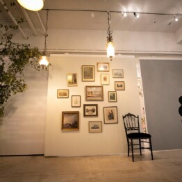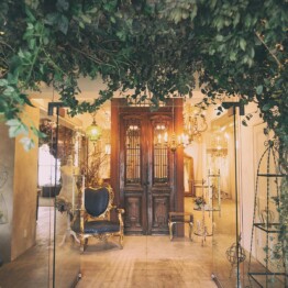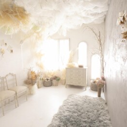 大きなメインテーブルの先にあるこの空間は、アンティークのドアやトランクを配置し、天井を大きなシャンデリアとドライフラワーで彩った、非日常を味わえるスタジオです。